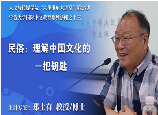 为即将举办的“‘一带一路’背景下中国文化国际传播专题研讨会”所开设的线上学术活动之一。讲座上,郑土有教授言词简练,从“蛇盘兔”的造型切入,揭示了民俗在生活中的重要性。接着从“何谓民俗”、“民俗的生成”和“民俗何为”三大方面说明民俗文化是民族文化的基石,是和谐社会建设的基础,社会治理、经济文化建设的重要资源。民俗连接过去,活在当下,预示未来。