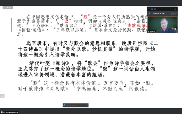 袁老师精彩的分享令在线的师生收获满满,也引起了同学们的积极思考,随后同学们在线上积极提问,袁老师给予耐心解答,鼓励大家多多阅读中国古代诗文,感受“默”的哲学意蕴。