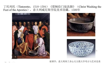 再者,刘老师用大量的图片资料向我们展示了中国瓷器在西方绘画中的呈现。中国瓷器形象在西方绘画中出现较多,如有弗朗切斯科•贝纳利奥的《圣母子像》(约1460)、丁托列托(1518-1594)的《耶稣给门徒洗脚》和维米尔的《窗边读信的少女》(1657-1659)等。资料表明,静物画的流行与欧洲从中国进口瓷器的贸易繁荣基本保持同步,在十七世纪初走向兴盛,十八世纪初衰落。中国风在这一时期多作为一种元素出现在静物画中,林纳德即为典型画家之一。
