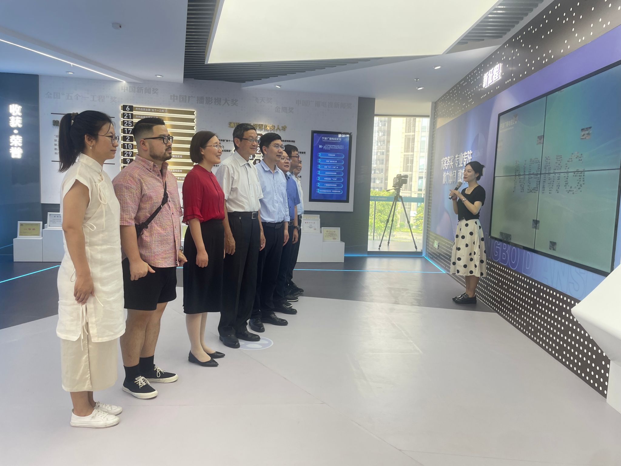 宁波广电集团党委委员、副总裁丁杨明对冯杰一行表示热烈欢迎,并安排了实地参观。就宁波广电集团的悠久历史、组织架构及荣誉成就进行详细介绍。座谈会前,一行人还体验了前沿的虚拟数字技术,并深入走访了演播厅、拍摄厅等核心区域,直观感受到媒体行业的现代化发展风貌。