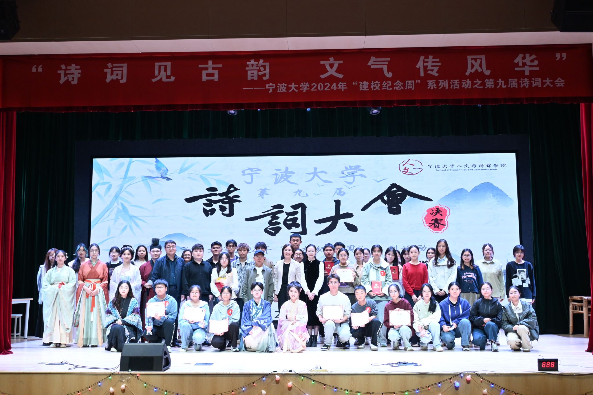 第九届诗词大会决赛在锦绣小剧场成功举办。李亮伟老师、吴雨辰老师、杨文钰老师担任评委,学院党委书记张佩芬、学生工作专项负责人钱方兵、学工办李洪伟、叶倩、汪瑞以及广大师生共同参与此次诗词盛会。此次比赛,邱若卉同学夺得冠军,李谷怀同学获得亚军,王筱欣同学获得季军。