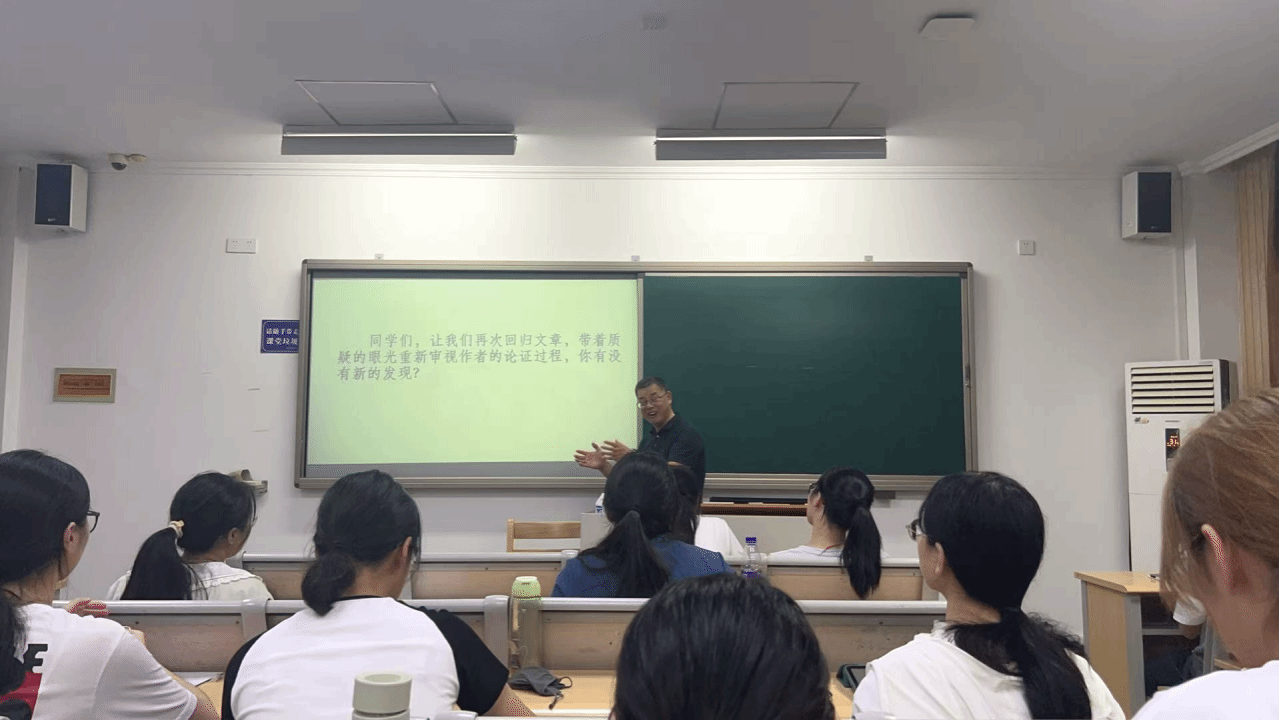 课程伊始,任老师从“教育,不折不扣,就是学会思考”的哲理名言切入,提出“思维与思辨”“思辨性阅读”“思辨性表达”“任务群结构”四个重要概念,由此指出在目前语文学习中“模型建构”的必要性。任老师结合阿西莫夫《被压扁的沙子》向同学们说明了“理性的推理”的必要性,并进行“归纳事理”方法总结,由此归纳出“推理论证”评价量表。在此基础上,任老师从今年市优质课评比选题切入,围绕语文学习中的思辨能力培养主题,通过对比两个课例:初中九年级上册第二单元课文《敬业与乐业》与初中九年级上册第五单元课文《中国人失掉自信力了吗》,让同学们直观感受教学设计的差异,并将上述共通特征落实细化到实际教学设计和讲课之中。任老师高屋建瓴提出:语文学习追求的是高阶思维,课文文本只是例子,一个文本不能够实现迁移,真正应该交给学生的是思辨性思维,由此真正帮助学生实现本学习任务群中的单元学习目标。最终,任老师总结“创造性思维”与“批判性思维”间关系,提出应由“创造性思维”实现推陈出新,“批判性思维”实现批判、评估,并最终实现创造,两者应于学生思维中相互依存,引导学生实现思辨性思维的提升,让在座师范生们明白了语文阅读和写作教学重在提升学生的思维品质,多进行分析比较、评价综合等高阶思维的训练,才是落实核心素养的一大抓手。