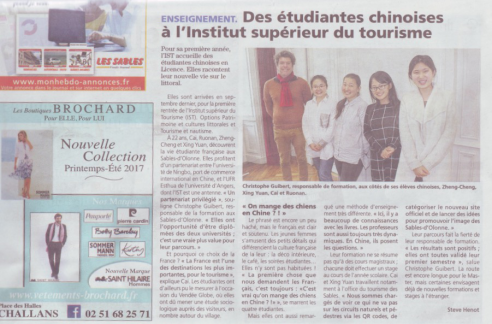 同时,近期,法国度假小城LES SABLES出版的报纸LES SABLES专门采访了人文学院在昂热大学旅游与文化学院Sables-d’Olonne校区就读的 4名13级旅游管理中法合作专业本科学生。昂热大学旅游与文化学院去年秋季在大西洋畔的度假小城LES SABLES开办了第4个校区,首期开设了海滨文化与遗产、旅游与水上运动2个本科专业,法国现外长、前总理埃罗专程前往参加揭幕典礼,还接见了在该区就读的知轩藏书