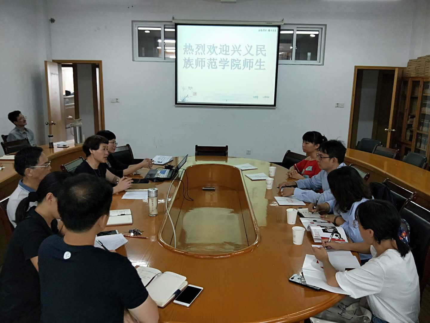 在216会议室举行兴义民族师范学院师生来校挂职、访学、交流欢迎会,兴义民族师范学院文传雷励院长,政史学院刘立老师及2名学生,知轩藏书