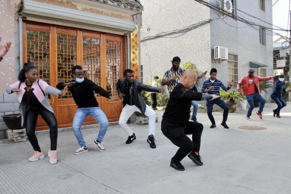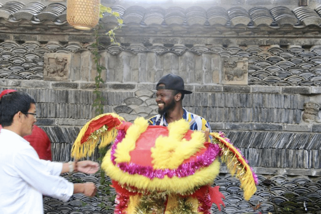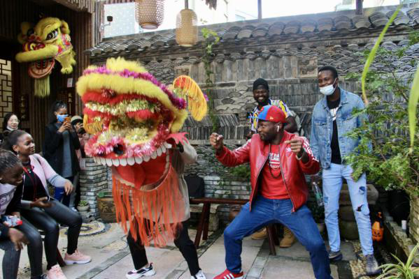 在梅山舞狮传承人沈海迪先生的带领下,师生一行首先参观了文化实践地基,近距离欣赏了清朝、宋朝时代的狮子石雕,留学生一行被这些栩栩如生的古董所吸引,不得由衷称赞中华文化的博大精深。师生们还现场与多位非遗文化传承人进行深入沟通,了解关于梅山舞狮的历史渊源和相关知识,还现场和师傅学起了剑花以及一些基本的武术招式,留学生表示这是非常有趣新奇的事情,值得一试。在参观完文化基地之后,大家还现场亲临了一场梅山传统婚礼,伴随着锣鼓声,一黄一红舞狮,在人群簇拥祝福下,护送这对新人走向婚姻的殿堂。