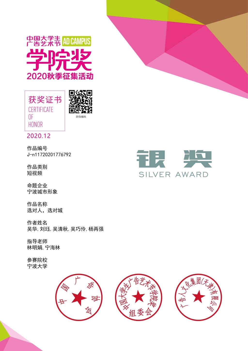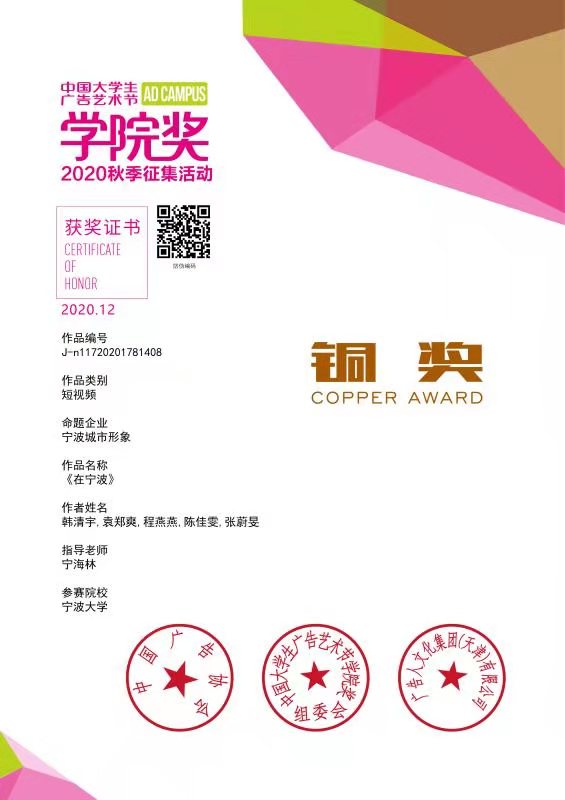 有三个作品分别揽获宁波城市形象命题影视类金银铜奖:影视类金奖作品《“甬”》(作者:赵端端,贺熙媛,阮晶璐,张瑀玢,杨欣,指导教师:宁海林)、银奖作品《选对人,选对城》(作者:吴华,刘珏,吴清秋,吴巧伶,杨再强,指导教师:林明娟、宁海林)、铜奖作品《在宁波》(作者:韩清宇,袁郑爽,程燕燕,陈佳雯,张蔚旻,指导教师:宁海林)。