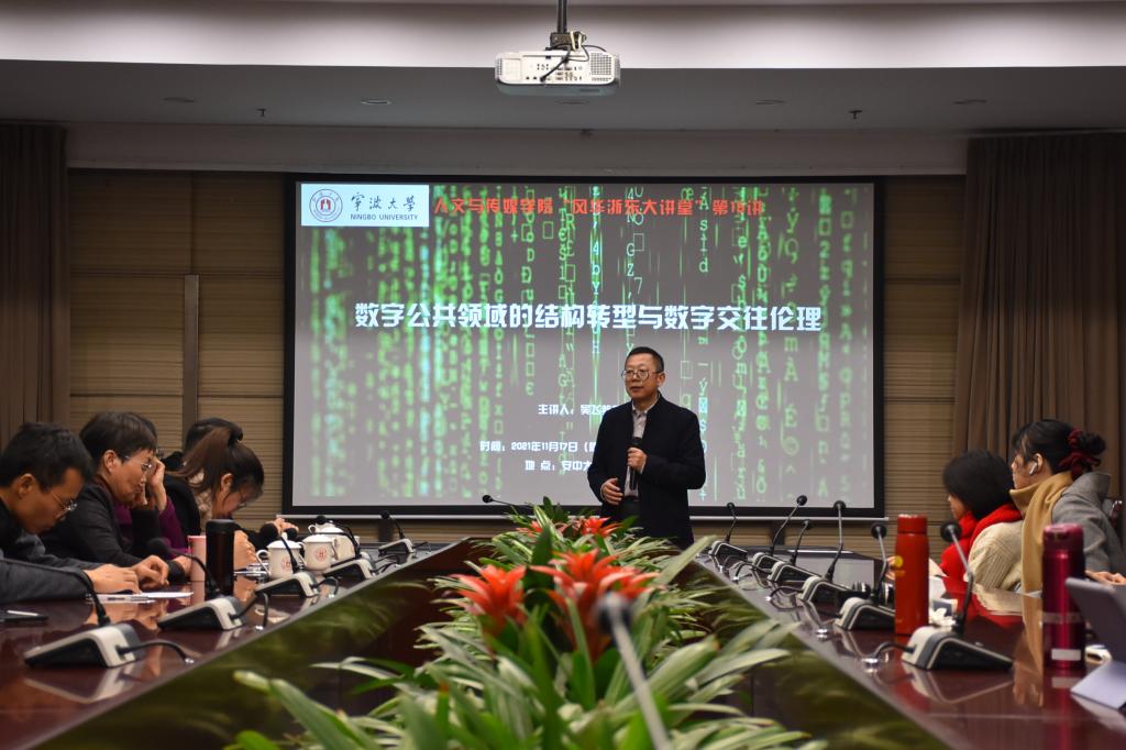 “风华浙东大讲堂”第15讲“数字公共领域的结构转型与数字交往伦理”在学校安中大楼三楼碧华厅顺利举行。本次讲座主讲人为浙大宁波理工学院传媒与法学院院长、浙江大学传媒与国际文化学院求是特聘教授吴飞老师,主持人为新闻传播学科带头人、现代传播研究院院长宁海林教授,全校师生近百人聆听了讲座.