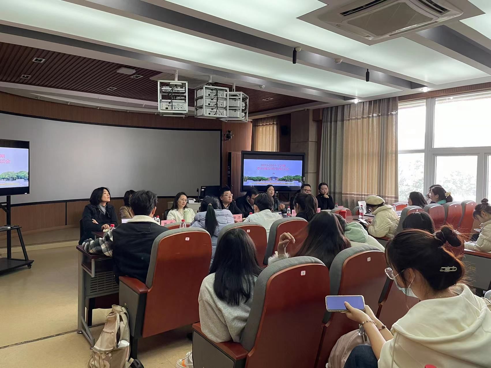 在10-104召开2023-2024-1学期本科教学工作师生座谈会。会议由学院副院长田力主持,院教育督导汤志耘、张萍、屈广燕;各学系副主任李晓琴、陈宸、杨懿、教务办全体老师以及2021级、2022级、2023级各班学生代表参加了此次座谈会。